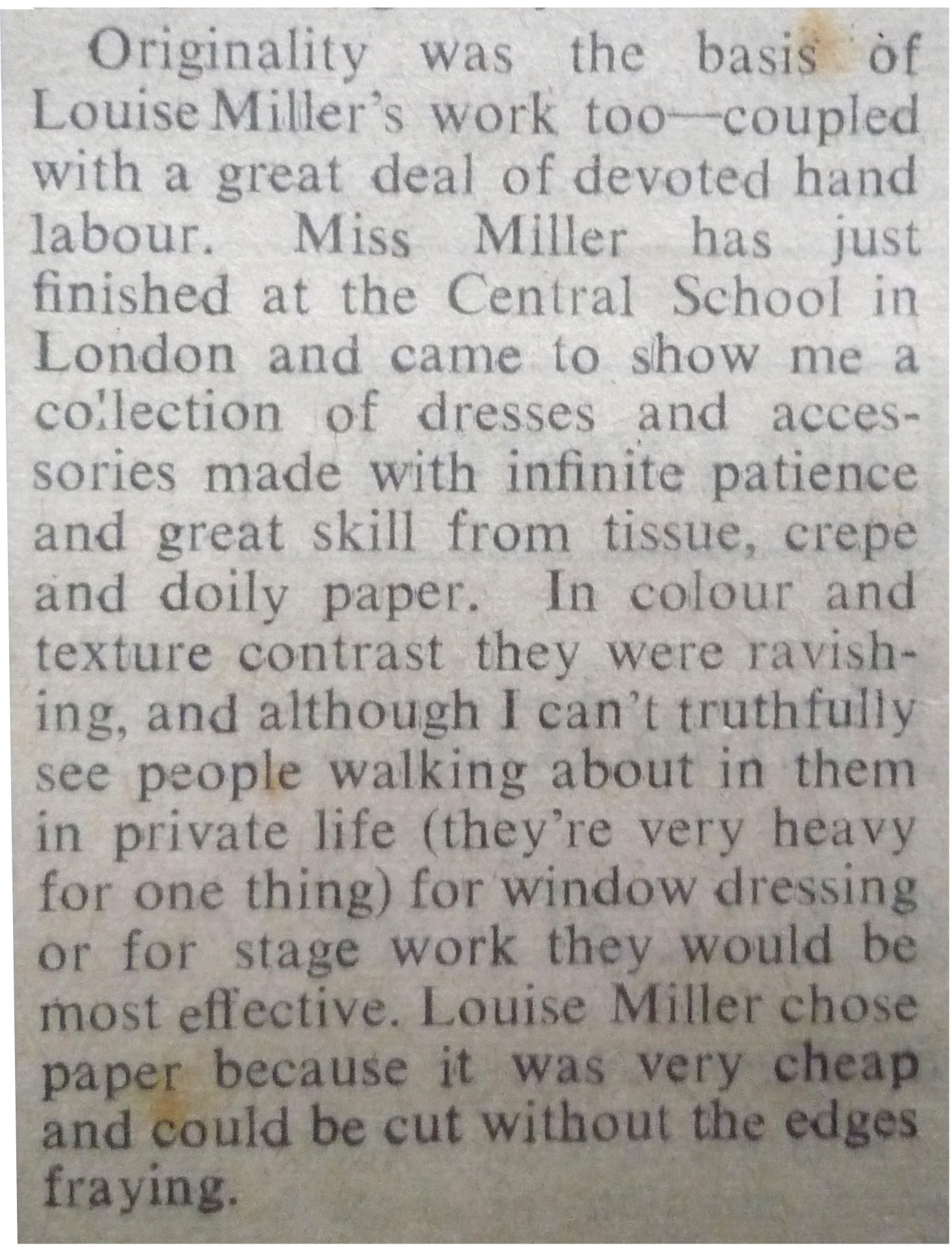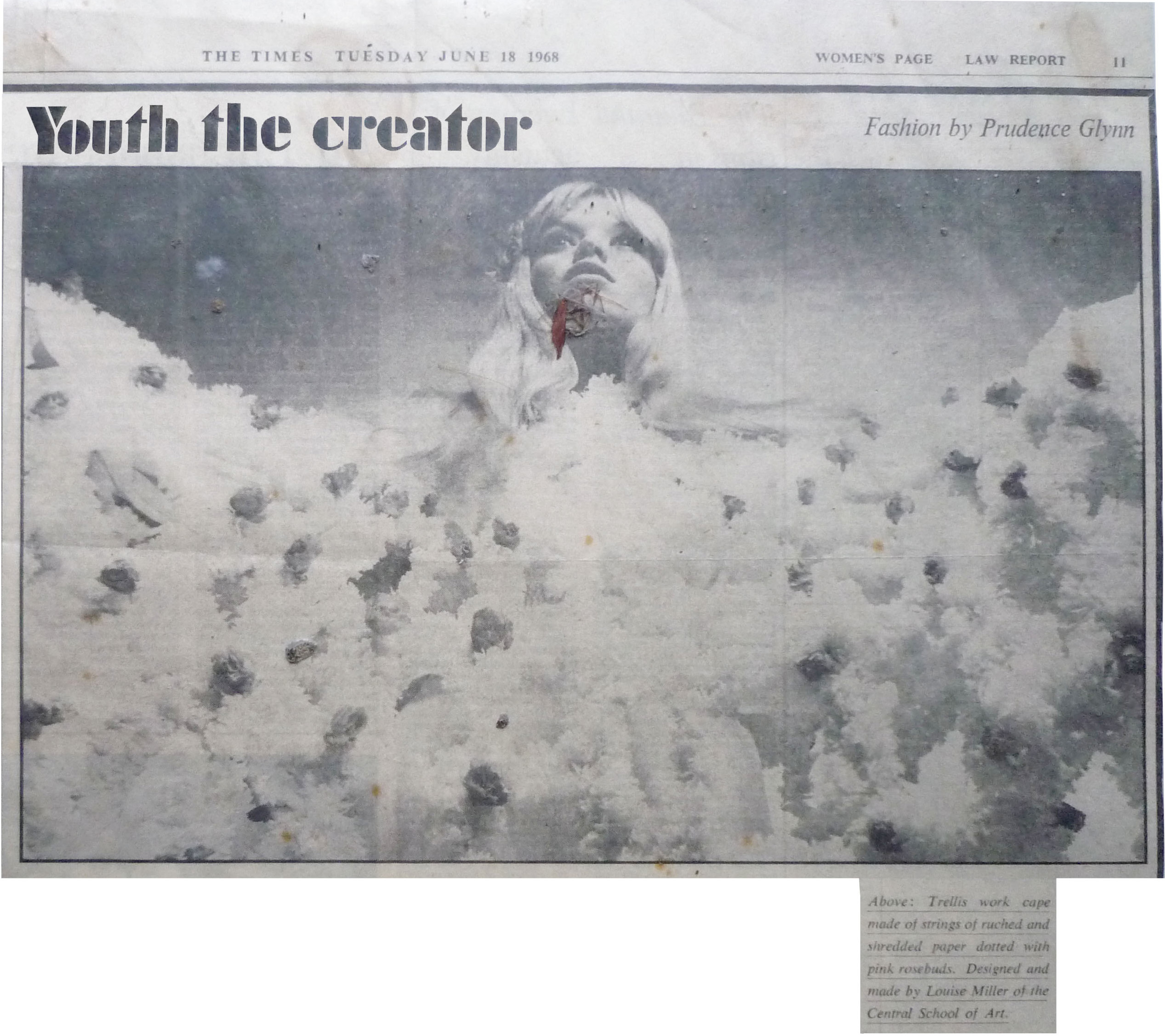 In 1968, Fashion Editor Prudence Glyn featured Louise’s Central School of Art & Crafts, Post- Graduate collection of delicate hand woven and embroidered paper dresses in her article Youth the Creator in The Times Newspaper.